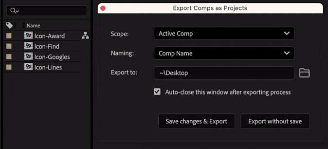 - Selected Comps (Separate Project Files): exports each selected composition into a separate project file