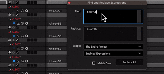 Finds and replaces strings in expressions on selected layers or properties or across the entire project